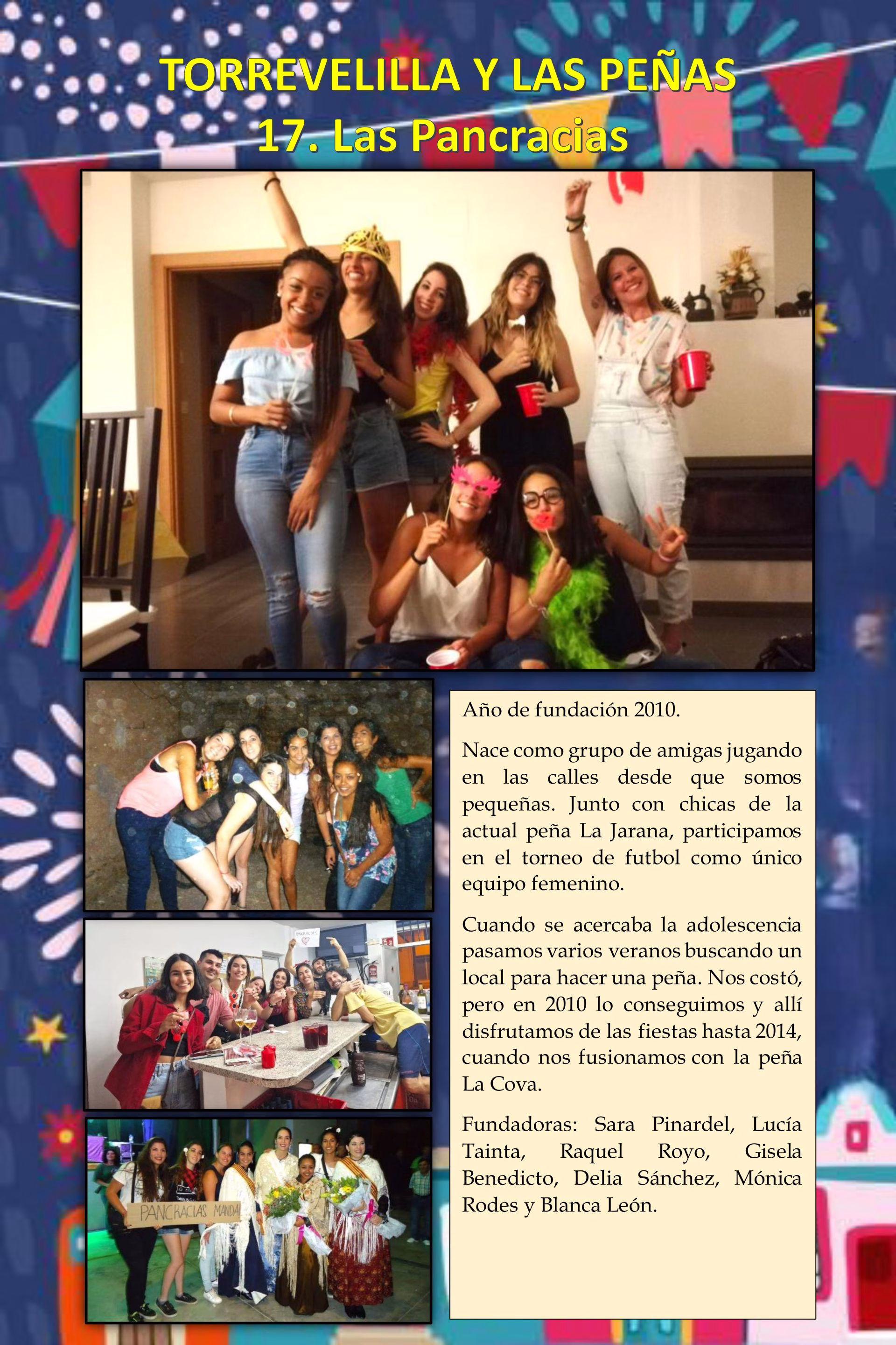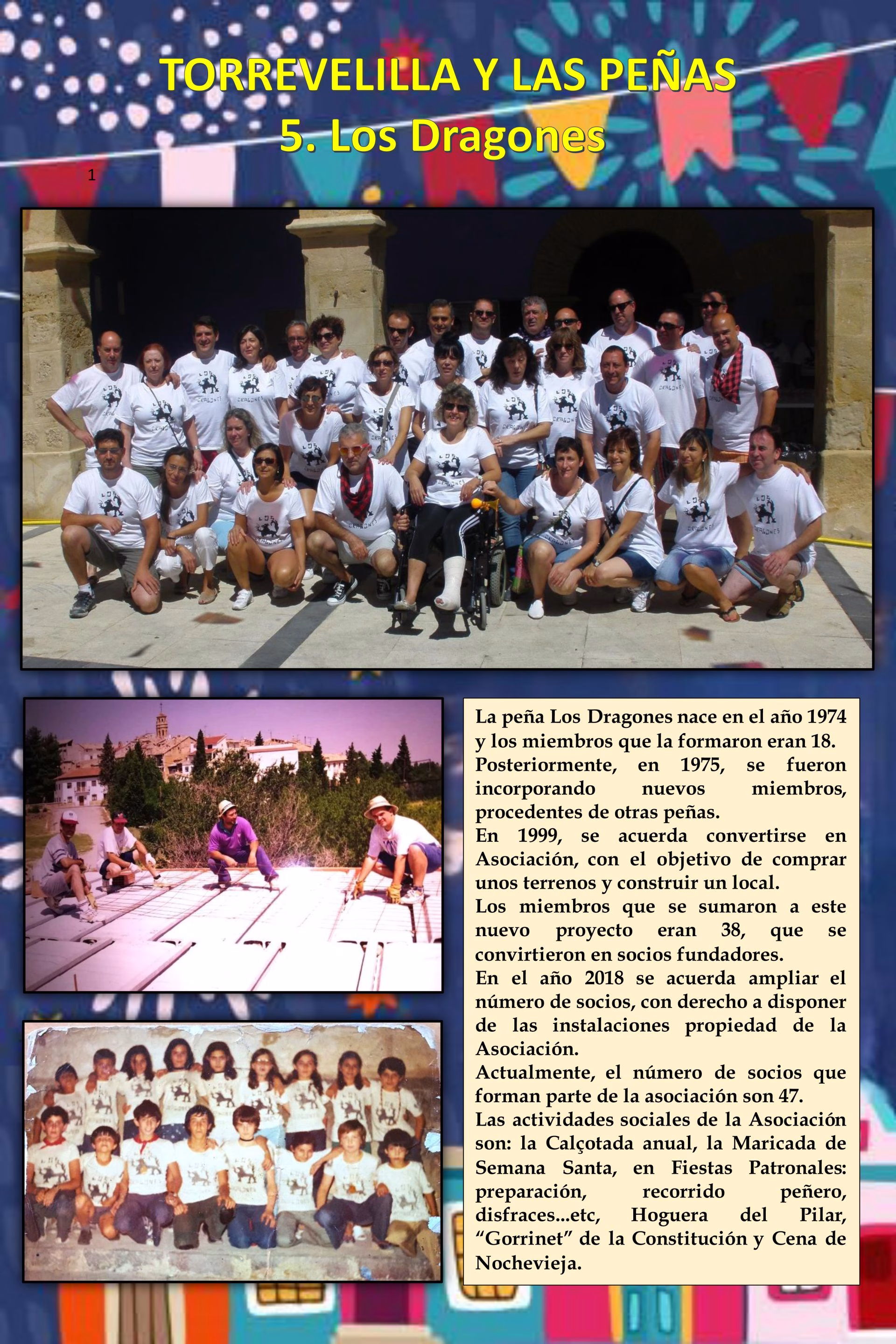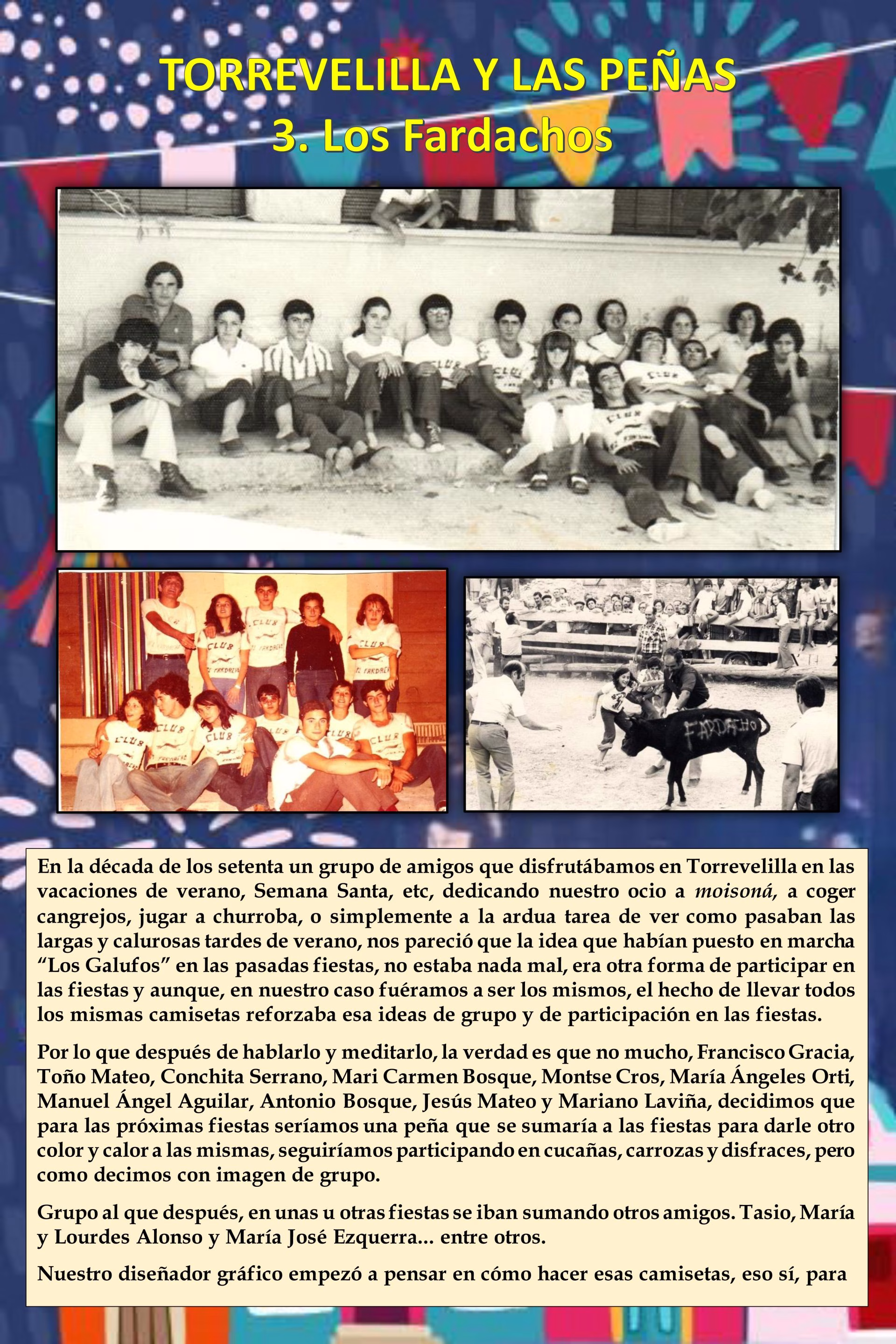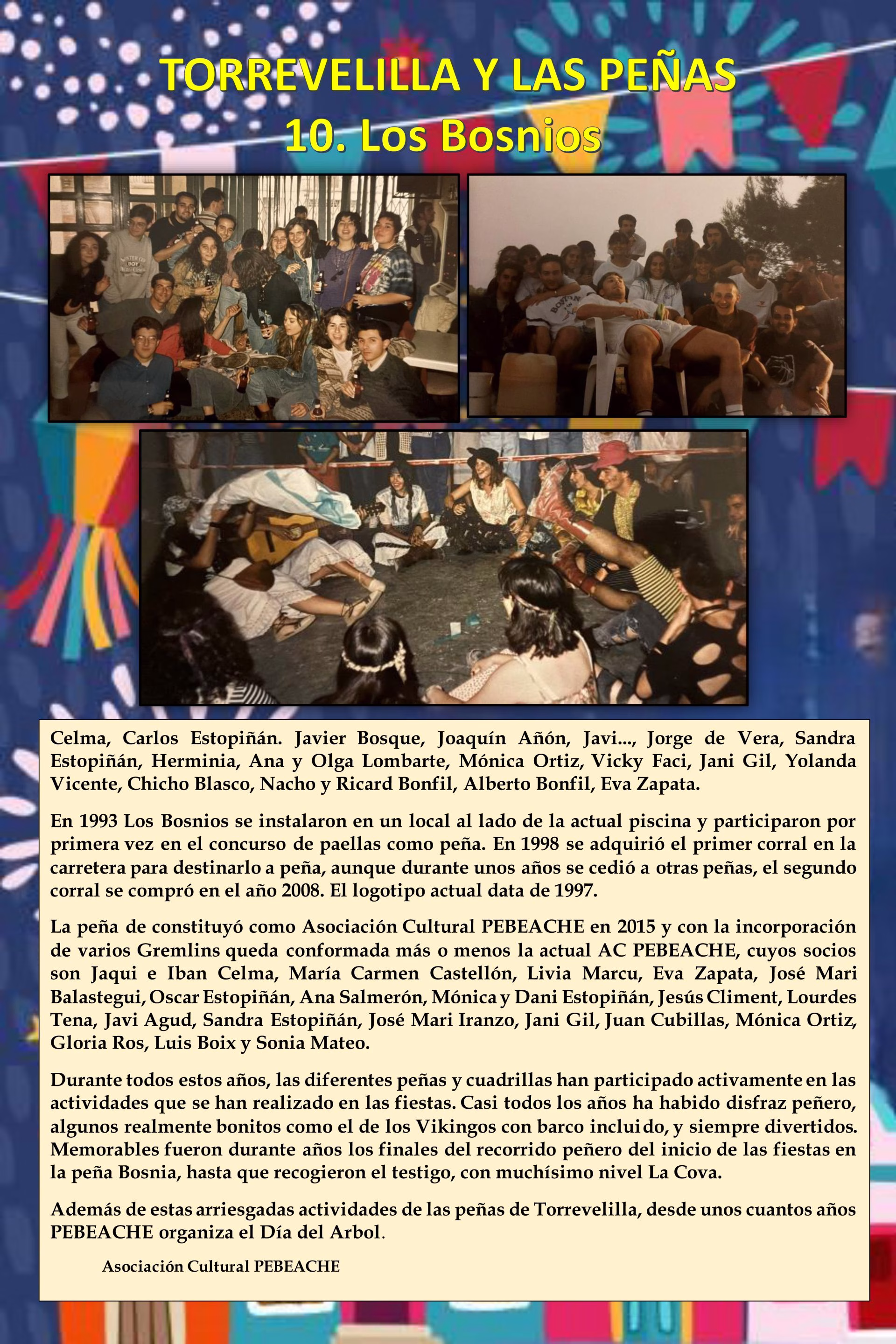 Peñas históricas: Recordaremos aquellas agrupaciones ya desaparecidas pero que dejaron una huella imborrable en la memoria colectiva, conocidas por su papel central en las fiestas patronales, la organización de cucañas, verbenas y la preparación de carrozas.